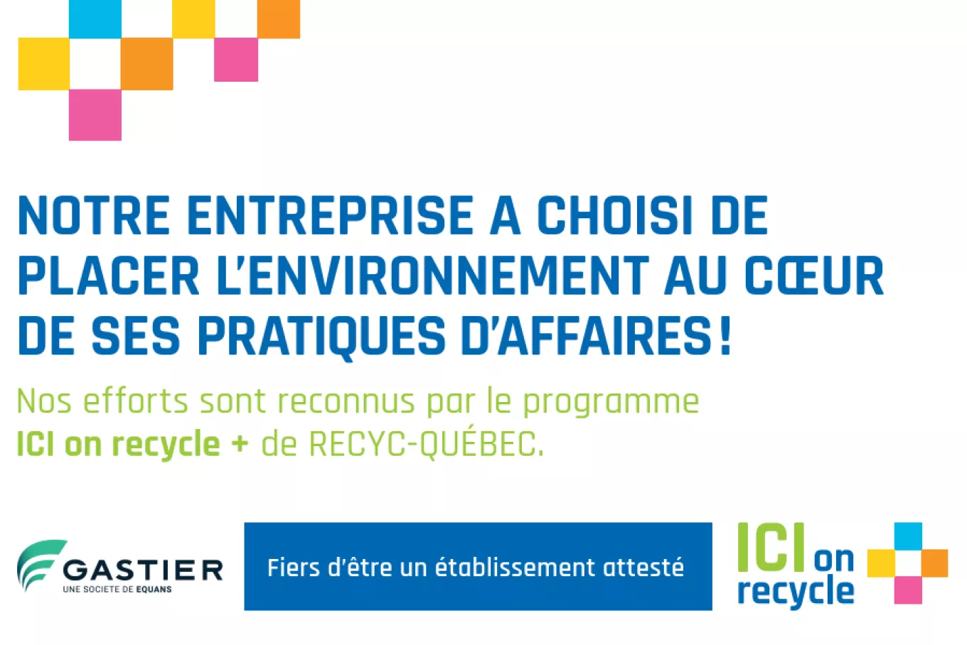 GASTIER est fier d’annoncer l’obtention de l’attestation ICI on recycle + Niveau Performance, décernée par RECYC-QUÉBEC.